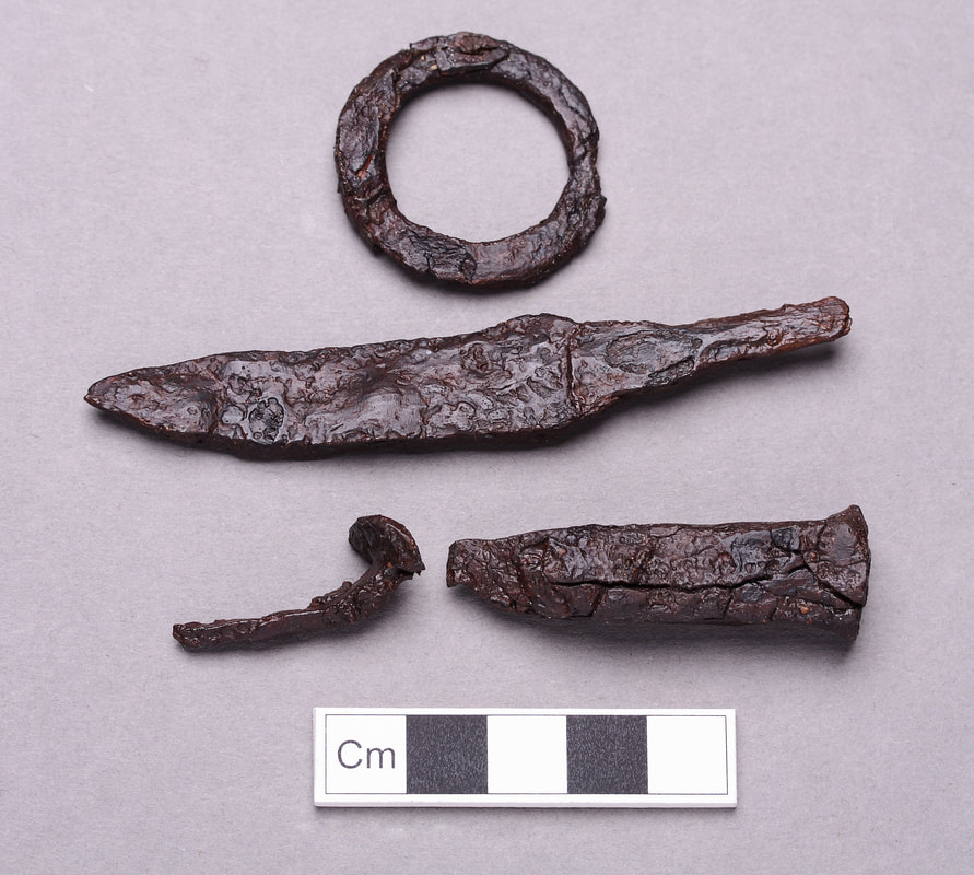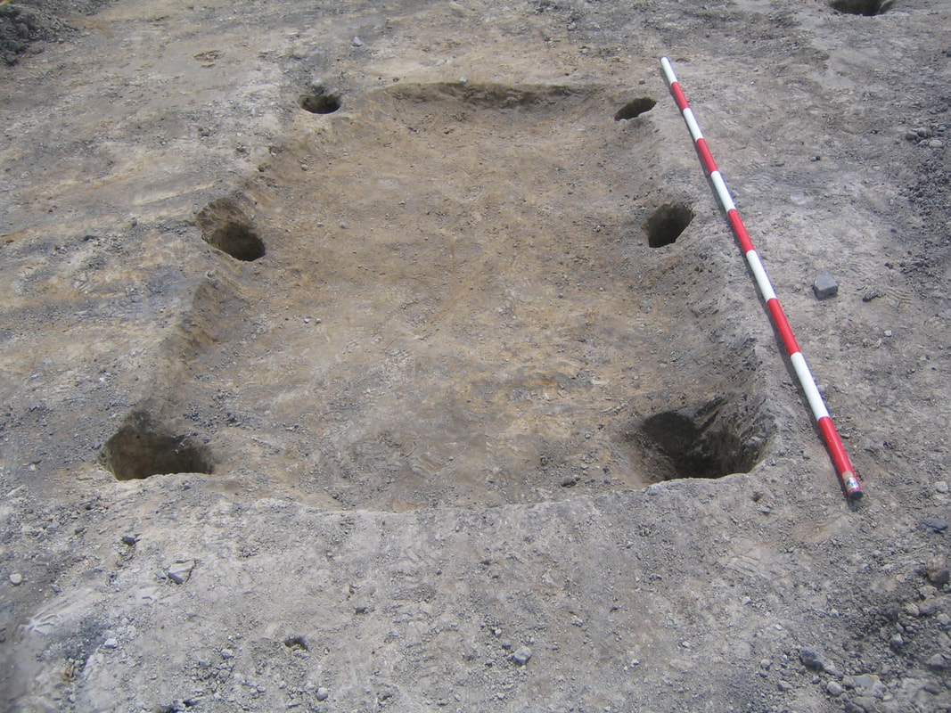 While the initial phase of burial was developing at the southeast of the site, a very different form of activity was initiated at the north end. Here, evidence was identified for settlement, agricultural activity, and also light industry in the form of metal working. A ‘four-poster’ or elevated platform is believed to represent an elevated grain store, the elevated position both keeping the grain dry and providing some protection from rodents. A ‘six-poster’ structure was also identified, again interpreted as a grain store. Environmental analysis confirmed that hulled barley and oats were being stored at the site.