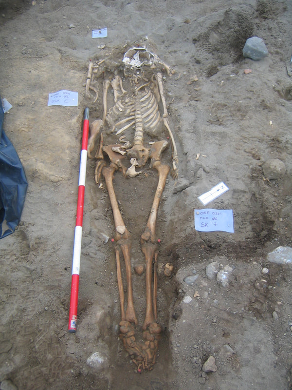 A total of 41 articulated burials and a further 10 dis-articulated burials were excavated during the investigations. The earliest burials were contemporary with the small rectangular enclosure and dated to the first half of the 7th century. These consisted of a group of 13 skeletons, which varied between east to west aligned graves and, more unusually, north to south aligned graves.