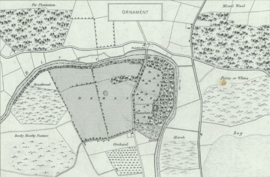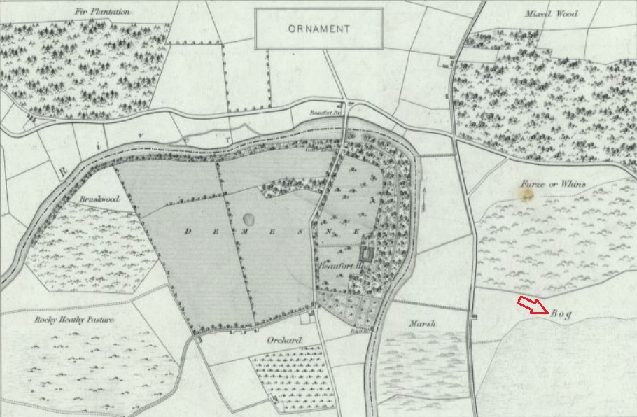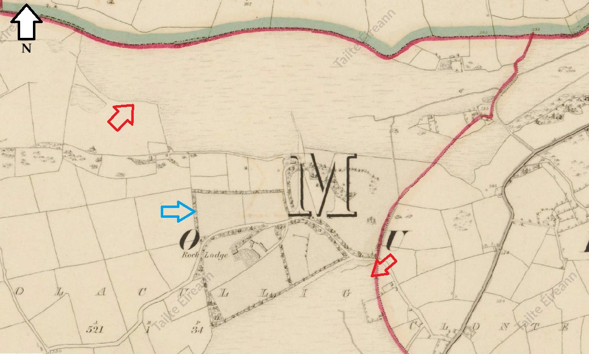 Using the characteristic sheet, we can examine one of Ordnance Survey sheets, CK072, from County Cork to determine the land type. Looking at the sheet, we can see that there is a large area of bog to the north and to the south (red arrows). You can also see that there is a demesne landscape (blue arrow) associated with Rock Lodge between the two areas of bog.